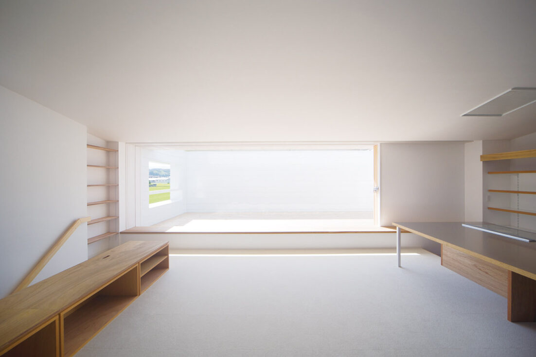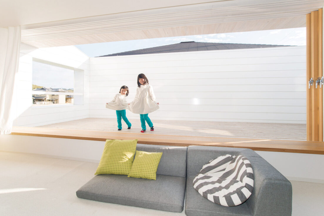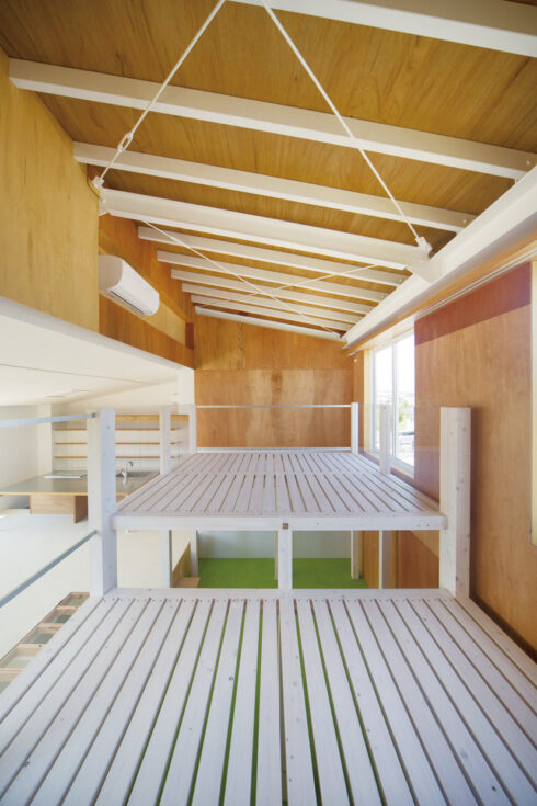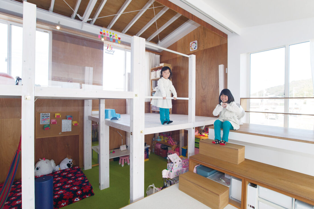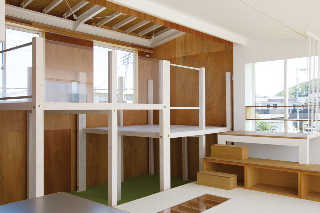 外観もさることながら、室内も唯一無二。2階はLDKにプラス、子ども部屋にもなるフリースペースをワンフロアに。個室と呼べるものは寝室のみ。ご主人は「子どもはもちろん、僕たち夫婦も〝部屋にこもる〟ことがない家(笑)。そもそも部屋がなければ、こもることも考えませんからね」と。それぞれの距離感は、天井高を生かした段差。フリースペースに設けた大きなスキップフロアが、その役割を果たします。あえて建物に固定せず2段ベッドのように家具として設置。子どもたちの成長に合わせて、自由に組み合わせを変えます。 「うちもそうですが、姉妹ならではかもしれませんね。大きくなると子ども同士で棚やぬいぐるみを使い、互いの居場所を作ります。自主性の芽生えに、子どもたちの成長を感じます」と佐原さん。建て主さんも子どもたちの変化を実感。「べったりと寄ってくることがなくなりました。逆に何でも自分たちでやりたがるぐらい」と、奥様もビックリです。